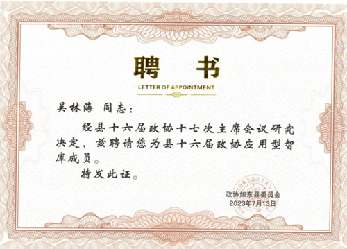 我所主任會(huì)計(jì)師吳林海同志被政協(xié)如東縣委員會(huì)